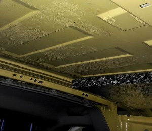 Meillä kului kolmisen viikkoa ennen kuin siirryimme kattoeristeiden laittamisesta verhoiluvaiheeseen ja tämän takia katosta ehti jo tippua muutamat äänieristelevyt alas, kun autolla ajettiin jotain tuhat kilometriä. Vaikka äänieristelevyissä on itsekiinnittyvä liimapinta, eivät levyt pysy paikoillaan, ellei niitä pidä mikään muu paikoillaan. Niiden pitää siis olla puristuksissa seiniä ja kattoa vasten. Katossa tämä ei ole ongelma, koska levyt puristuvat paikoilleen vanerien alla. Seiniinkin laitettiin eristelevy- ja ekovillakerrosten päälle takaisin paikoilleen ne vanerit, jotka autossa olivat olleet jo valmiiksi, ja siten äänieristeet pysyvät siellä tukevasti paikoillaan.