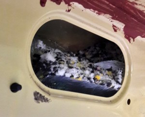 Kun laittelimme autoa sadesäällä (auton perä tallin sisällä ja takaovet olivat auki) tippui takana ulkopuolella olevalle askelmalle vettä. Selvisi, että siinä ovien yläpuolella on pieni ränni, jonka pitäisi ohjata katolta valuvat vedet sivuille, mutta tuo ränni fuskasi jostain keskeltä. Poistimme siitä tiivisteen ja sen alta paljastui joitain ruosteisia kohtia. Ensin piti odottaa pintojen kuivumista ja sitten ruosteet piti rapsutella pois ja maalata kohdat Ferrexillä. Sitten ränniin laitettiin liimaa tiivisteeksi (minulta meni ohi, että mitä liimaa).