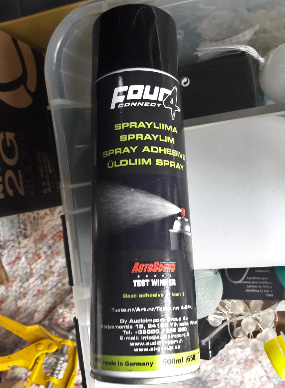 Sprayliiman käyttö tulee varmasti kalliimmaksi kuin jos käyttäisi jotain tuubiliimaa, mutta on se kätevää. Paitsi mitä nyt tuo Mastonin sprayliima pöllyää ympäriinsä. Meillä on uponnut jo sata euroa sprayliimaan, eikä se kuulosta järkevältä. Olemme ostaneet yhdeksän purkillista, joista vielä yksi on jäljellä ja se toivon mukaan tulee riittämään viimeisiin verhoiluihin. Jos olisimme käyttäneet vain 4Connectia tai Bolt-Offia, niin vähempi määrä olisi varmasti riittänyt.