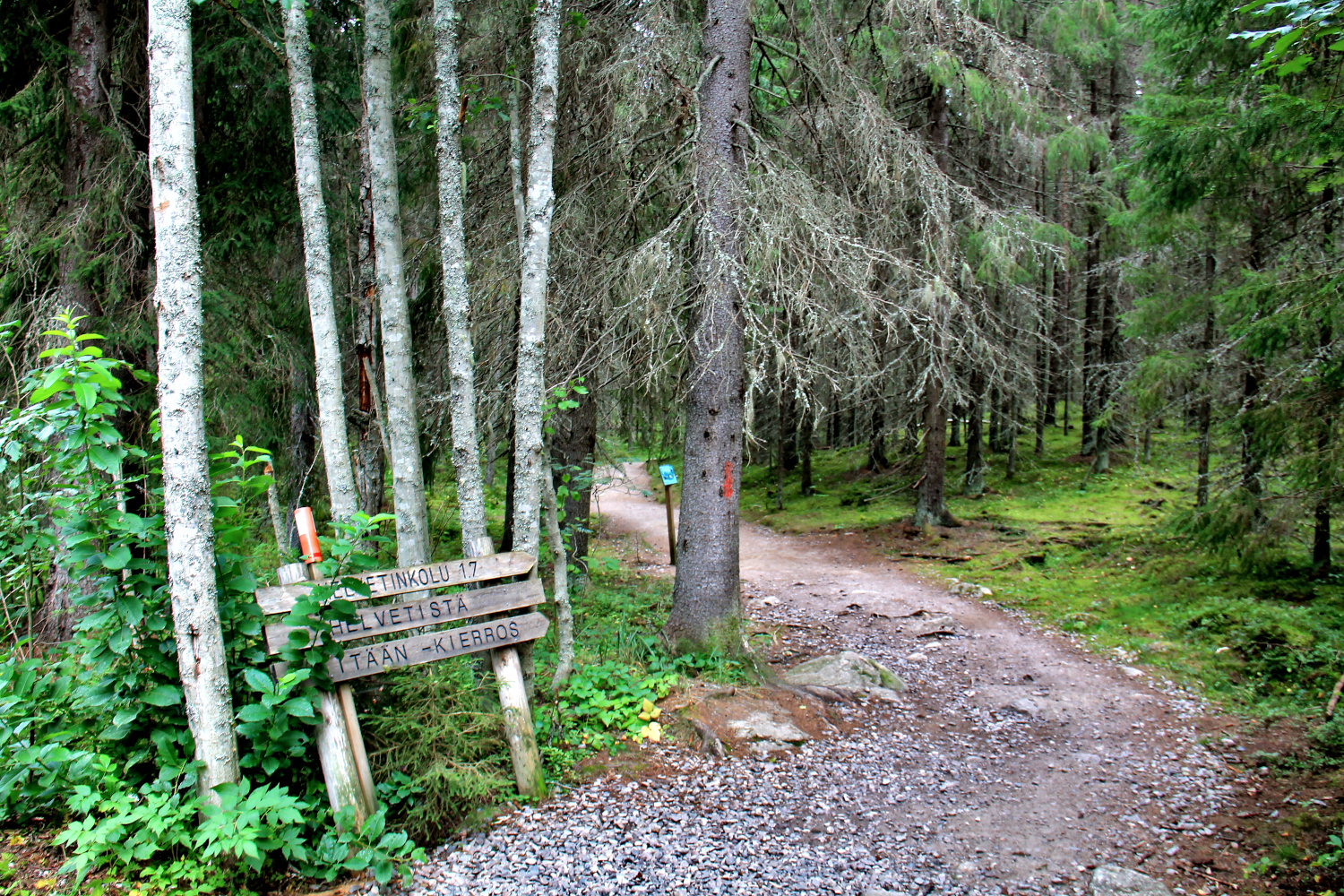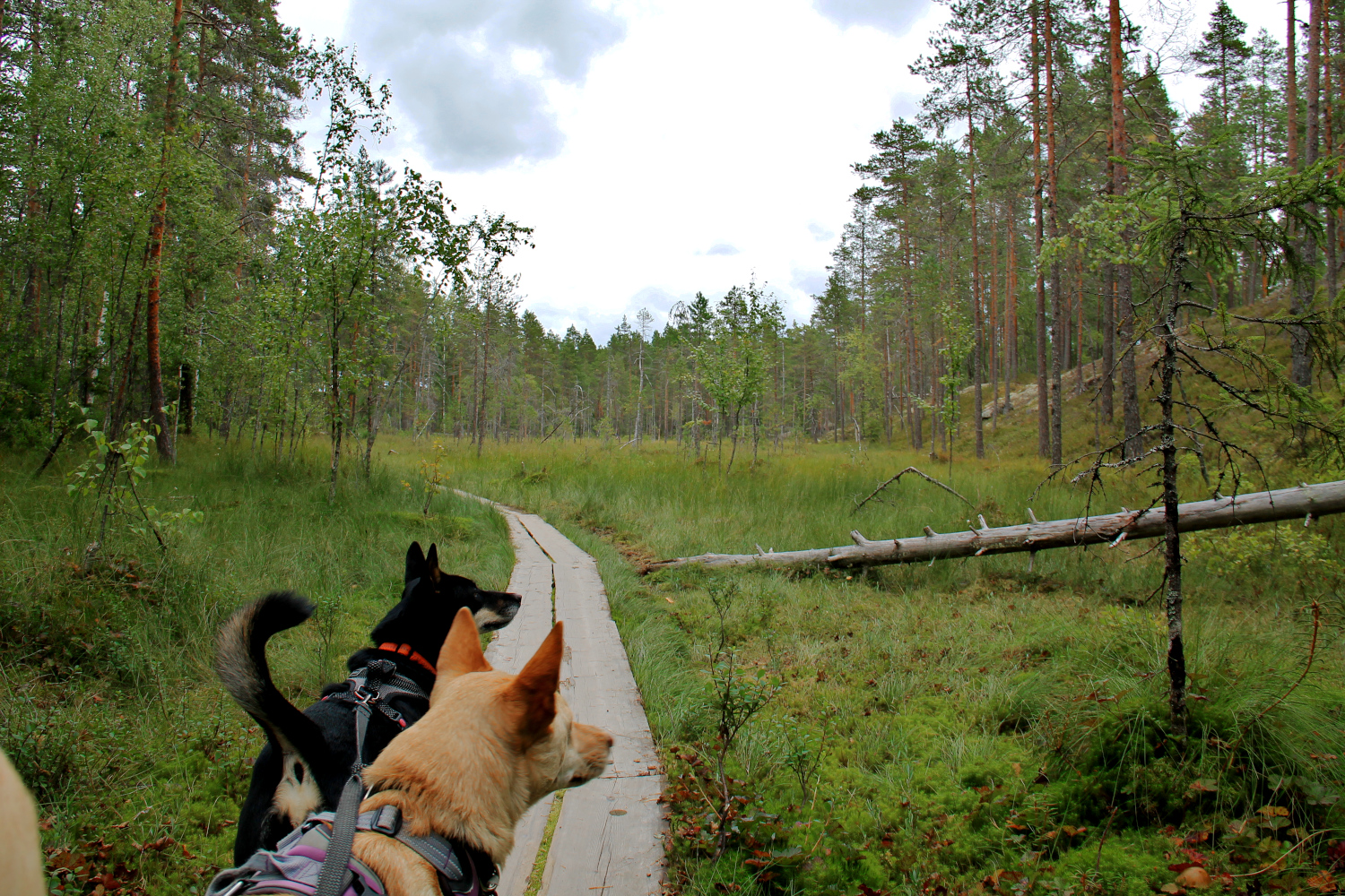 Seitsemisen kansallispuiston ja Riuttaskorven virkistysmetsän jälkeen yövyin Kurussa ja jatkoin koirineni Helvetinjärven kansallispuistoon. Valitsin reitin Ruoveden kautta, koska kuulin 65-tieltä lähtevän hiekkatien olevan hankala ison matkailuauton kanssa. 66-tieltä piti ajaa melkein 8 km hiekkatietä pitkin Kankimäen parkkipaikalle, mutta tie oli ok.
