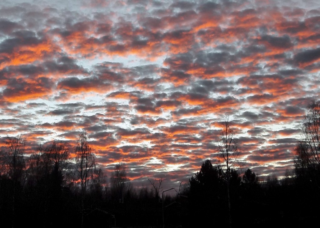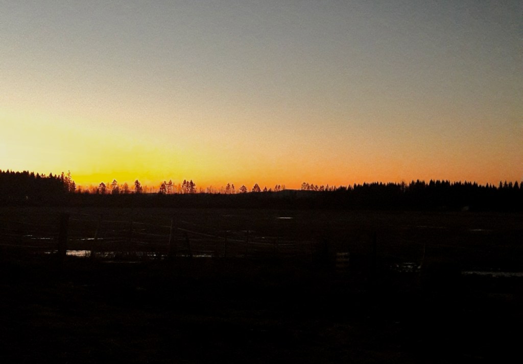 Auringonnousu joulukuussa. Jonnekin puiden latvojen tasolle aurinko ehkä tuosta pääsi.