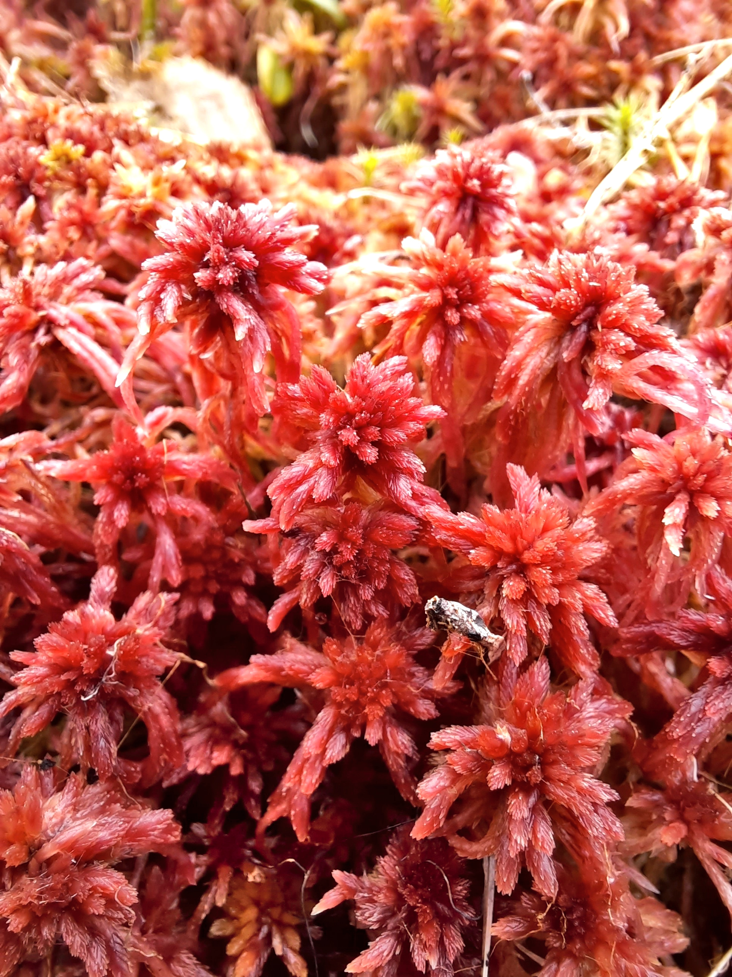 Sitten kävin kävelyillä paikoissa, joissa rahkasammalta oli runsaamminkin. On näkynyt punaisia rahkasammalia, ja rahkasammalia, joissa lehdet ovat toisia pidempiä ja haarautuvampia. Rahkasammalia on monia eri lajeja, enkä lähtenyt niitä opettelemaan.
