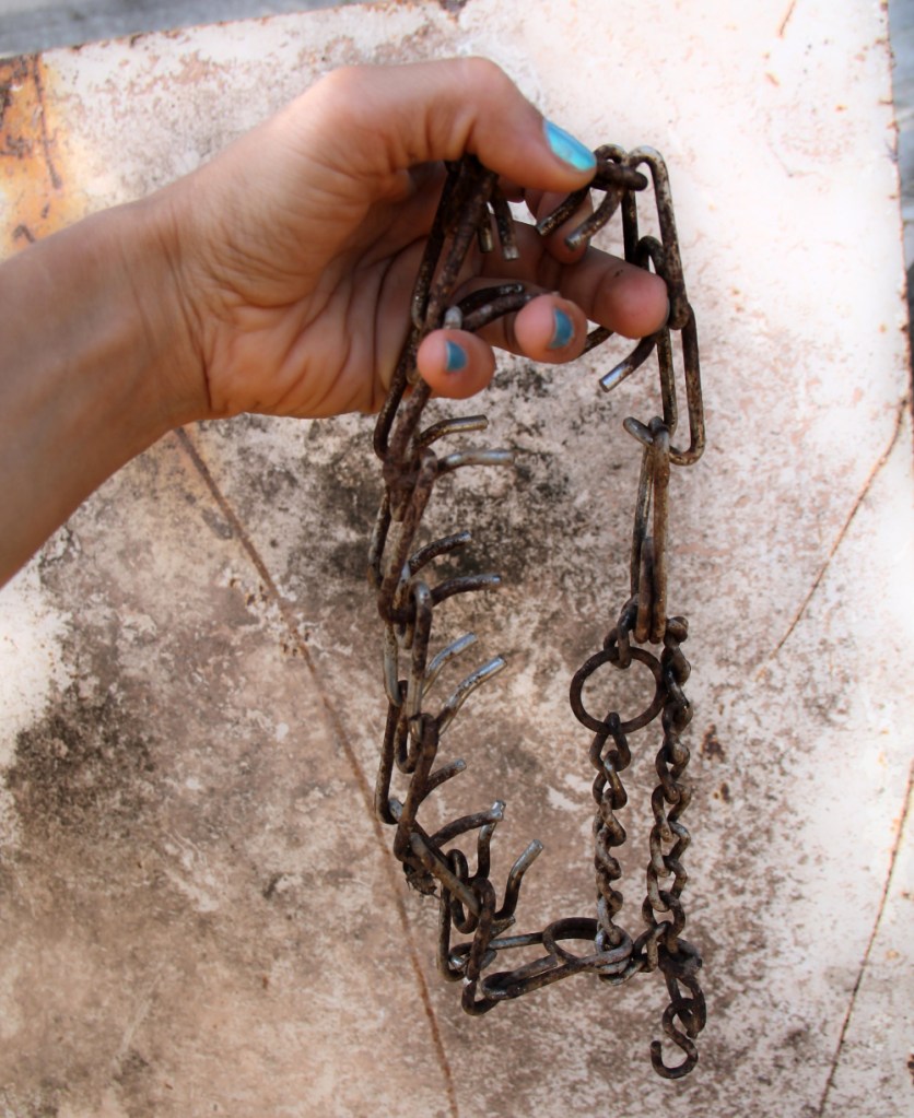 Hyvin aidatun vuokrakotimme pihan perällä oli peltikattoinen röttelö koirille. Siellä oli pari metrin pituista kettinkiä ja metallinen piikkikuristuspantakin löytyi. Espanjassa taitaa puuttua lait tällaisille asioille. Suomessa on Eläinsuojeluasetuksella kielletty paitsi piikkipannan käyttö, niin myös koirien metalliset ja kuristavat kaulapannat on kielletty kytketyiltä koirilta Valtioneuvoston asetuksella.