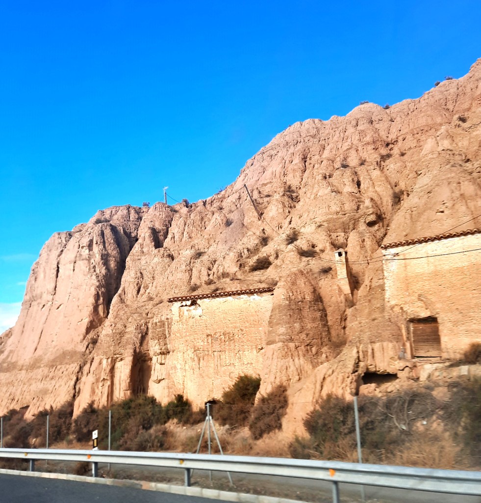 Päästiin Espanjan puolelle Suomesta reissun 7. päivänä, jos ensimmäiseksi päiväksi lasketaan päivä, jolloin otimme aamulla Helsinki-Tallinna-lautan. 7. päivänä ajoimme Lyonin pohjoispuolelta Barcelonan pohjoispuolelle Montsenyyn. Reissun viimeinen yö vietettiin Murciassa. Oli jo ihanan eteläespanjalaisen näköistä ja oloista. Ihania Espanjan maisemia. Murcian jälkeen lähdimme rantatieltä ajamaan Granadan kautta, kun muistelimme sen olevan rantatietä mukavampi reitti Málagaan. Guadixin kohdalla kuikuilin, näkyisikö tielle asti kallioissa olevia luola-asumuksia.Melkein perillä!Ihanaa kun ajaminen loppui ja saatiin olla vaan paikallaan.