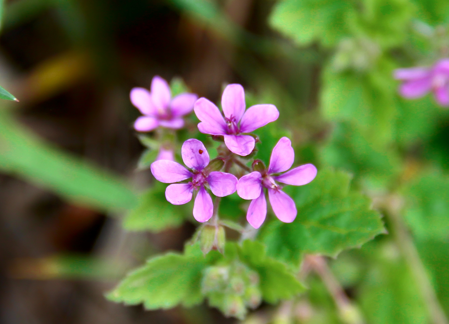 Tämä on varmaankin pehmytkurjennokka (erodium malacoides). Nämä toivat alun perin mieleen pienikokoiset malvat, mutta lehdet olivat erilaiset. Nämä tulivat vastaan sivulla spain-info.co.uk/gardening/wild-flowers/