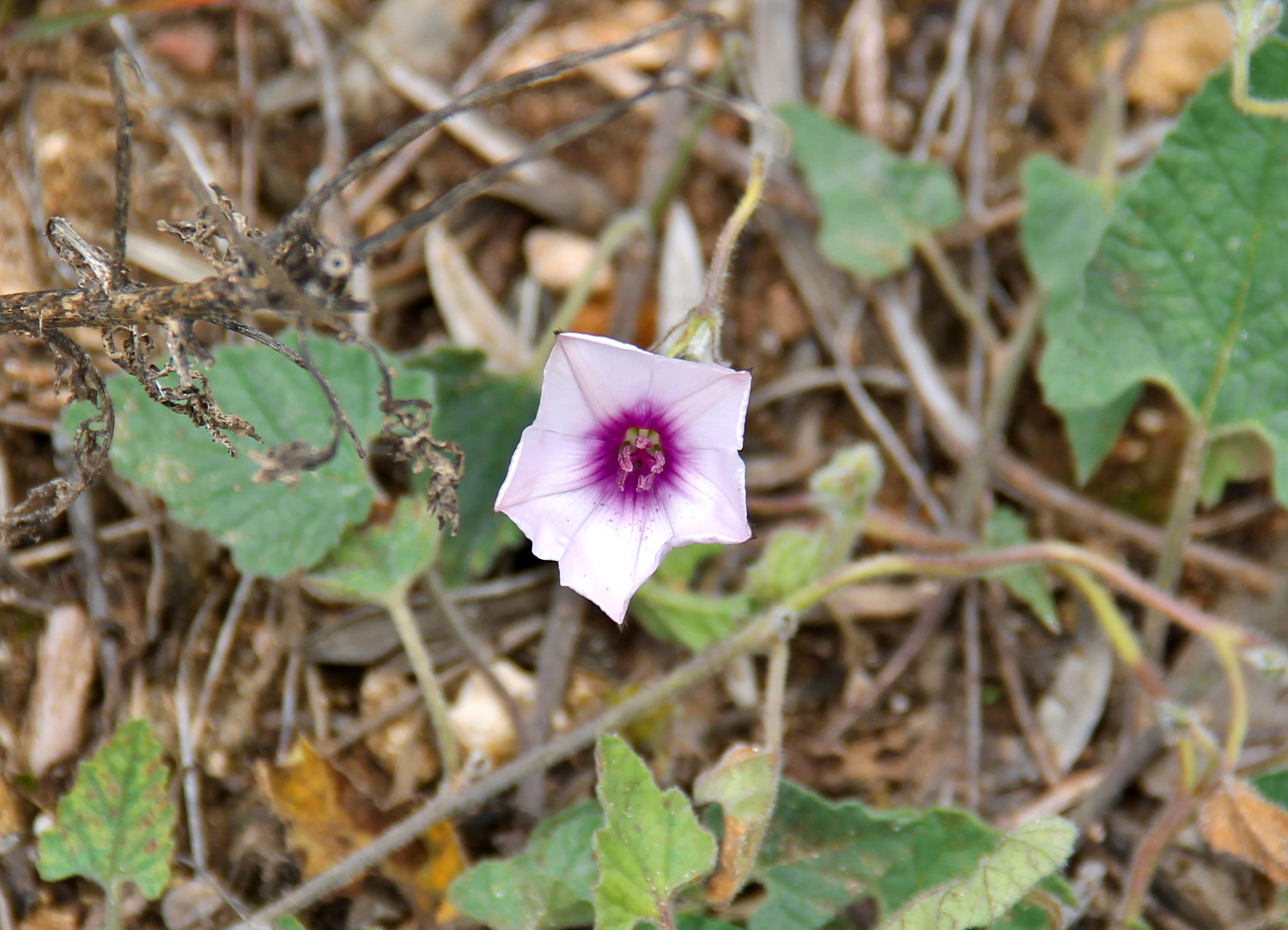 Tämä kiertokasvi on convolvulus meonanthus. Kukka oli hyvin pieni, läpimitaltaan ehkä viitisen senttiä. Aluksi näin vain kaksi kukkaa huhtikuussa, mutta toukokuussa niitä alkoi samalla paikalla olemaan enemmän. Ks. Floras y Setas de Españan sivulta >>