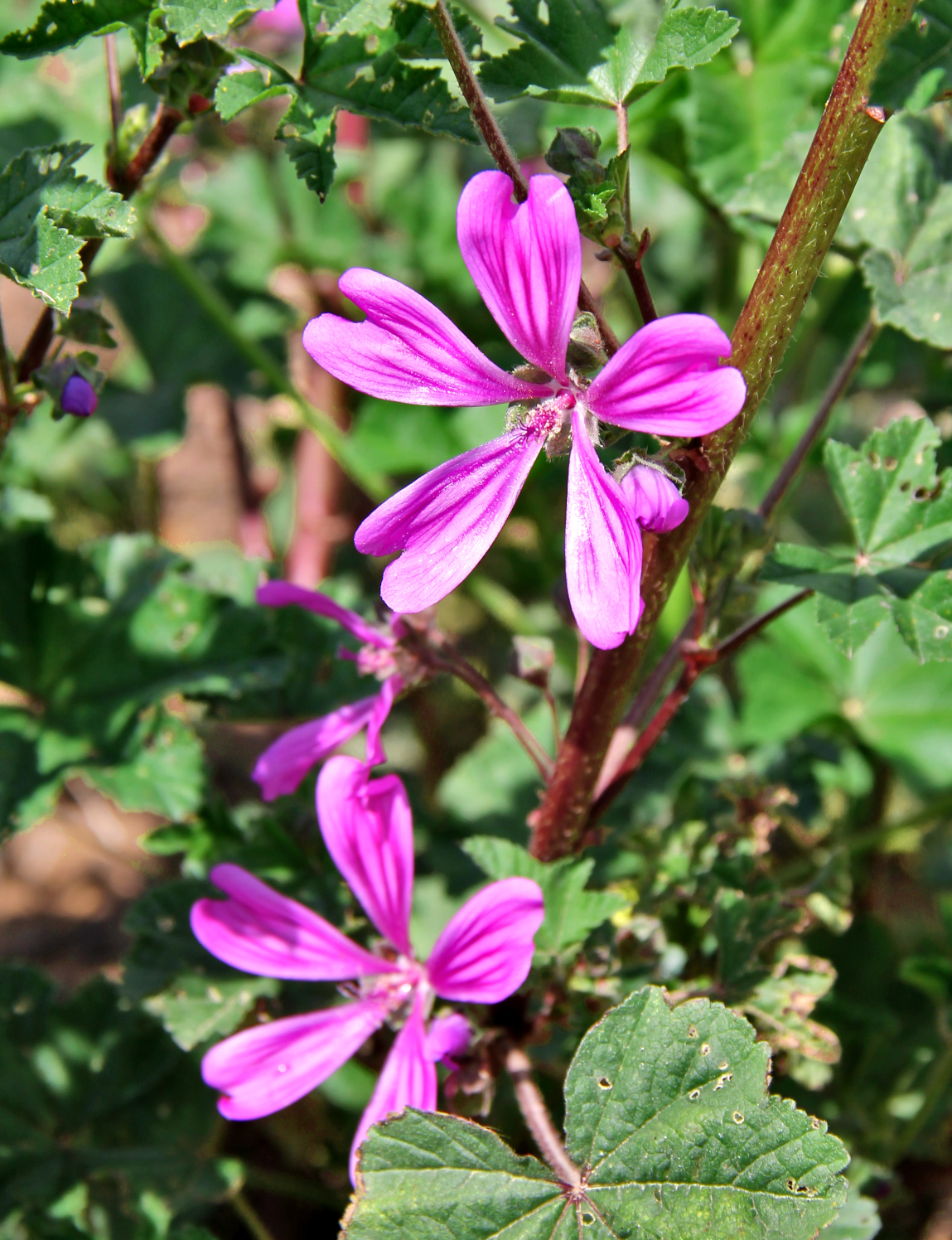 Tämä malva on varmastikin kiiltomalva (malva sylvestris), jota kasvaa täällä paljon. Ensimmäisen talven pihamme oliivitarha oli ihan täynnä malvan lehtiä joulu-tammikuussa, mutta sitten ne lakastuivat kukkimatta. Lehdet näyttivät isoilta karkeilta poimulehdiltä. Helmikuusta lähtien, tai ehkä jo aiemmin, siellä täällä hiekkatien laidalla ja pihallamme malvot sitten kuitenkin kukkivat aina toukokuulle asti. Niitä on monissa violetin sävyissä ja terälehtien muodot vaihtelevat.