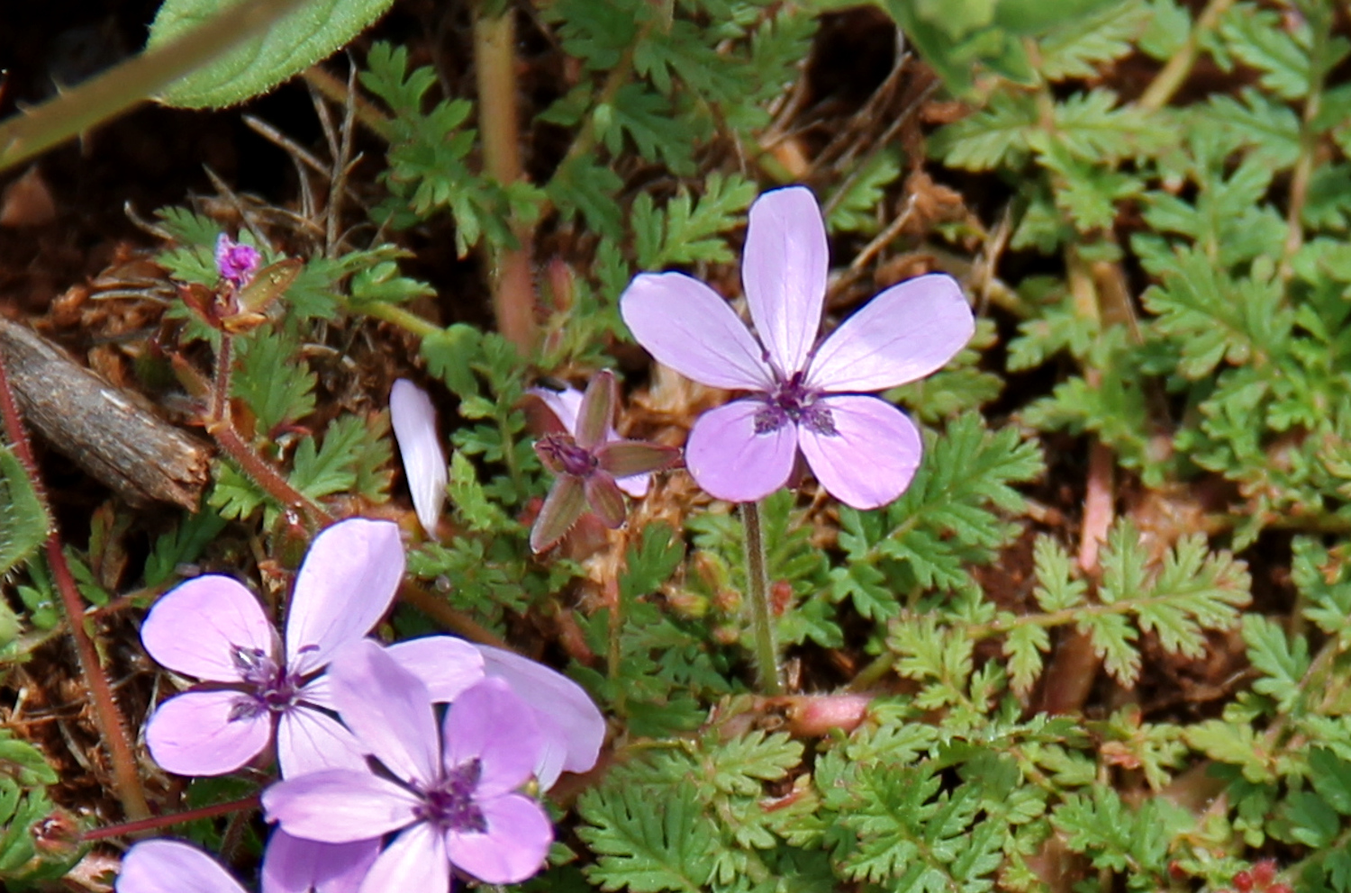 Tämäkin on yhdenlainen kurjennokka, varmaankin erodium aethiopicum. Terälehdet ovat ihmeellisen epäsäännölliset, kukka on ikään kuin vino, kun toiset terälehdet ovat toisia pidemmät. Kurjennokkiin kuuluu muillakin tavoin epäsäännöllisen näköisiä kukkia, koska joissain kukissa osassa niiden terälehtiä on laikkuja ja osassa ei.